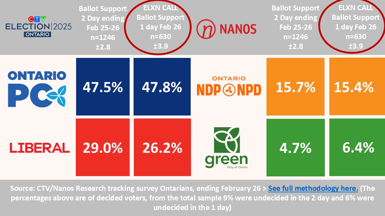 In a survey released on Wednesday night, Nanos said it interviewed 1,246 Ontarians on Feb. 25 and Feb. 26 and found that among decided voters, about 47.5 per cent said they planned to vote for the PCs, compared to 29 per cent for the Liberals. About 15.7 per cent said they support the NDP and 4.7 per cent said they support the Green Party.