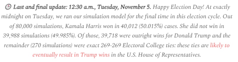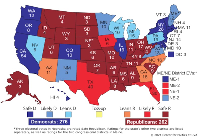 Some outlets predict the breakdown of the electoral college instead of giving a percentage chance. The Center of Politics at UVA published Sabato’s Crystal Ball, which predicts the Harris winning with 276 electoral votes compared to Trump’s 262.