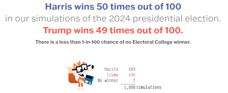 In their simulations, ABC News’s FiveThirtyEight has Harris winning 50 per cent of the time and Trump winning 49 per cent of the time.