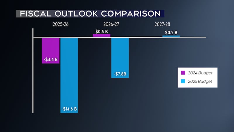 A deficit of $7.8 billion is expected in 2026-27 instead of the $500 million surplus that had been projected previously.