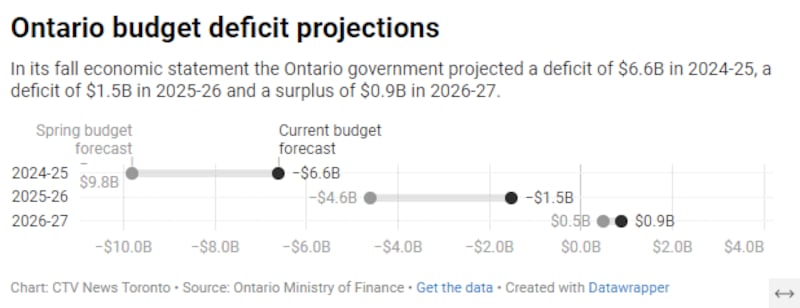 The deficit for 2024-25 now stands at $6.6 billion, down from the $9.8 billion included in the 2024 budget. The province is now projecting a revised deficit of $1.5 billion for 2025-26 and a small surplus of $900 million in 2026-27.